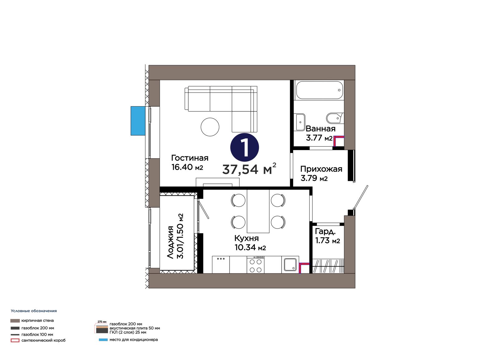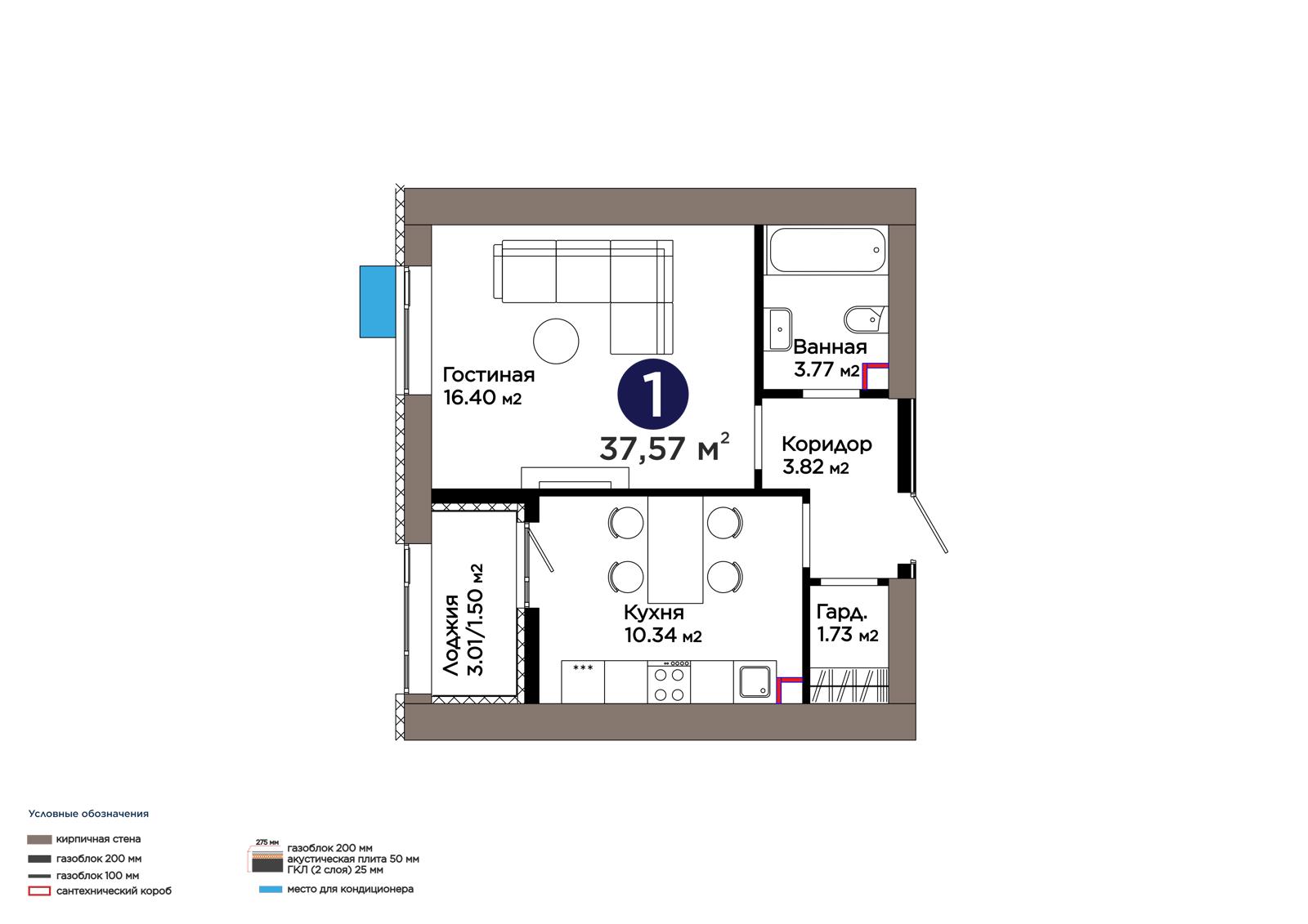 1-комн., 37.54 м², 4 этаж из 9 г. Астана, ЖК Lavita