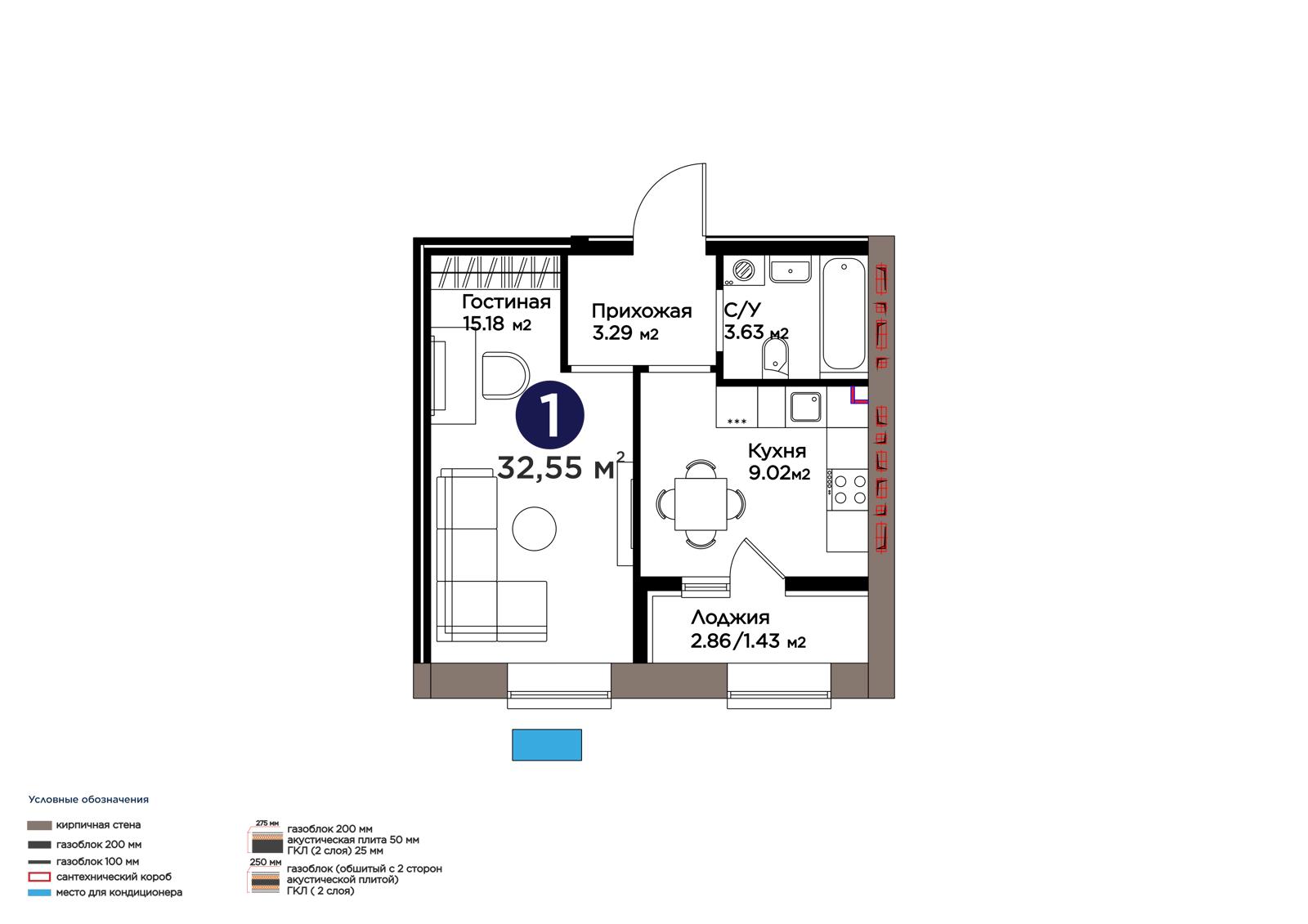 1-комн., 32.55 м², 4 этаж из 9 г. Астана, ЖК OİU