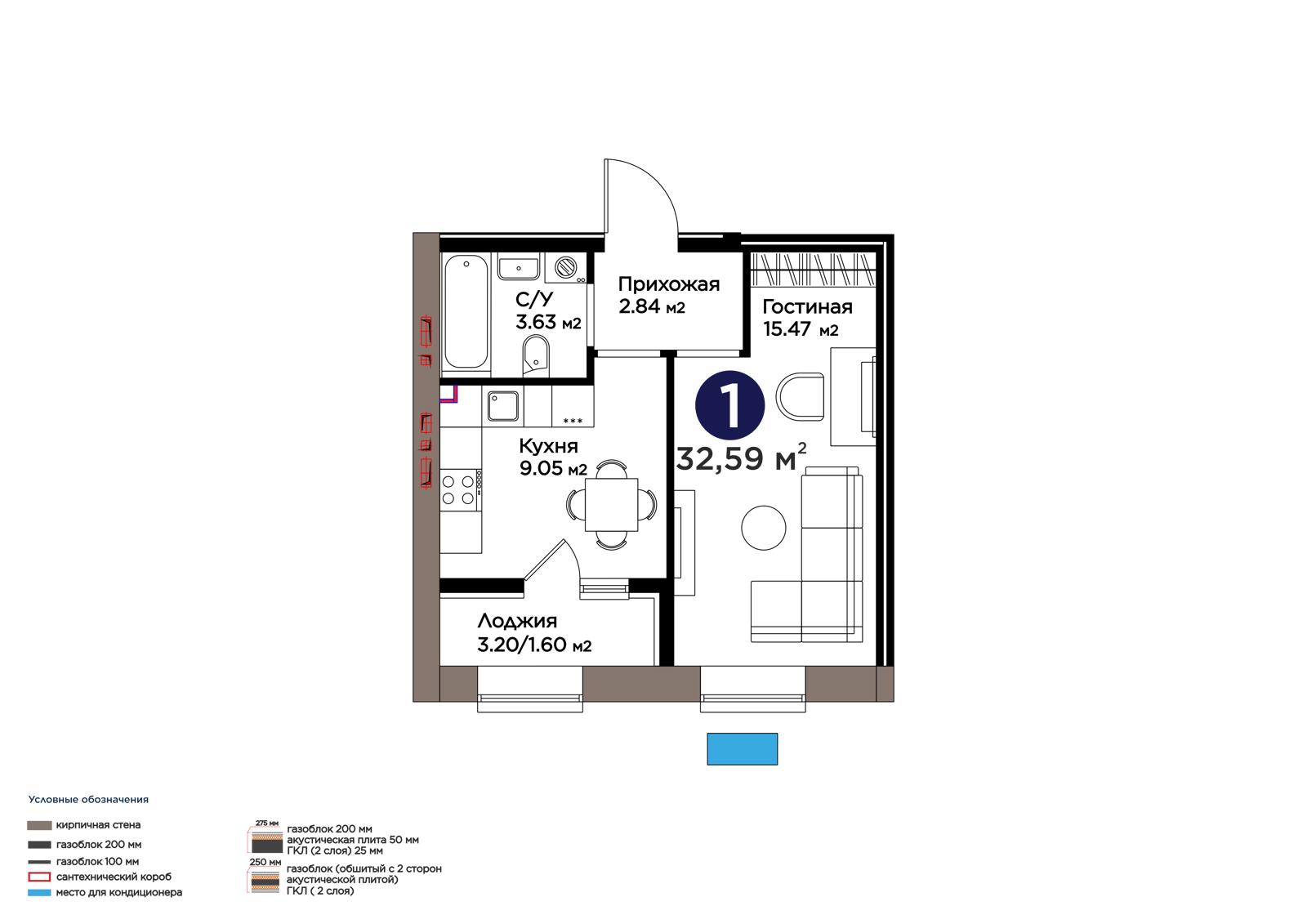 1-комн., 32.59 м², 7 этаж из 9 г. Астана, ЖК OİU