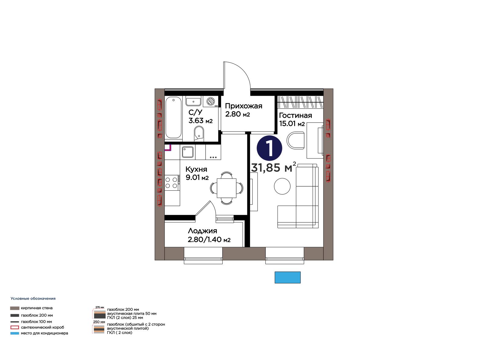 1-комн., 31.85 м², 5 этаж из 9 г. Астана, ЖК OİU