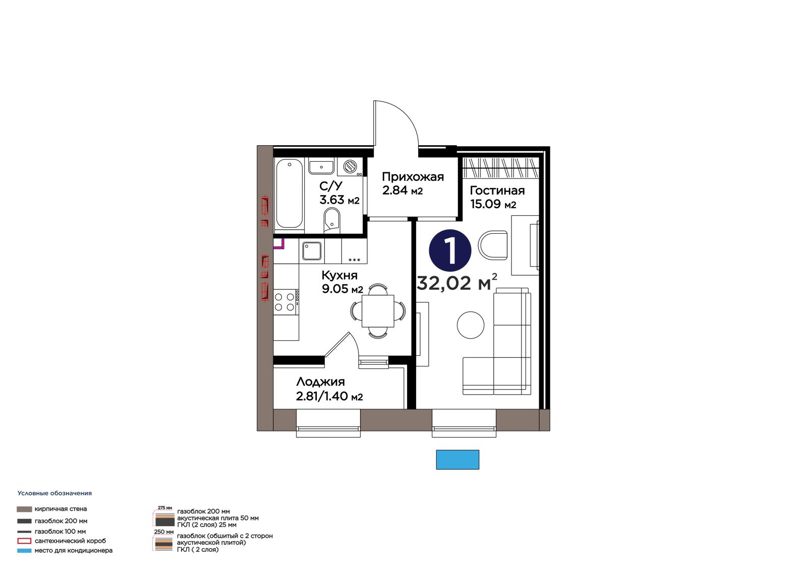 1-комн., 32.02 м², 5 этаж из 9 г. Астана, ЖК OİU