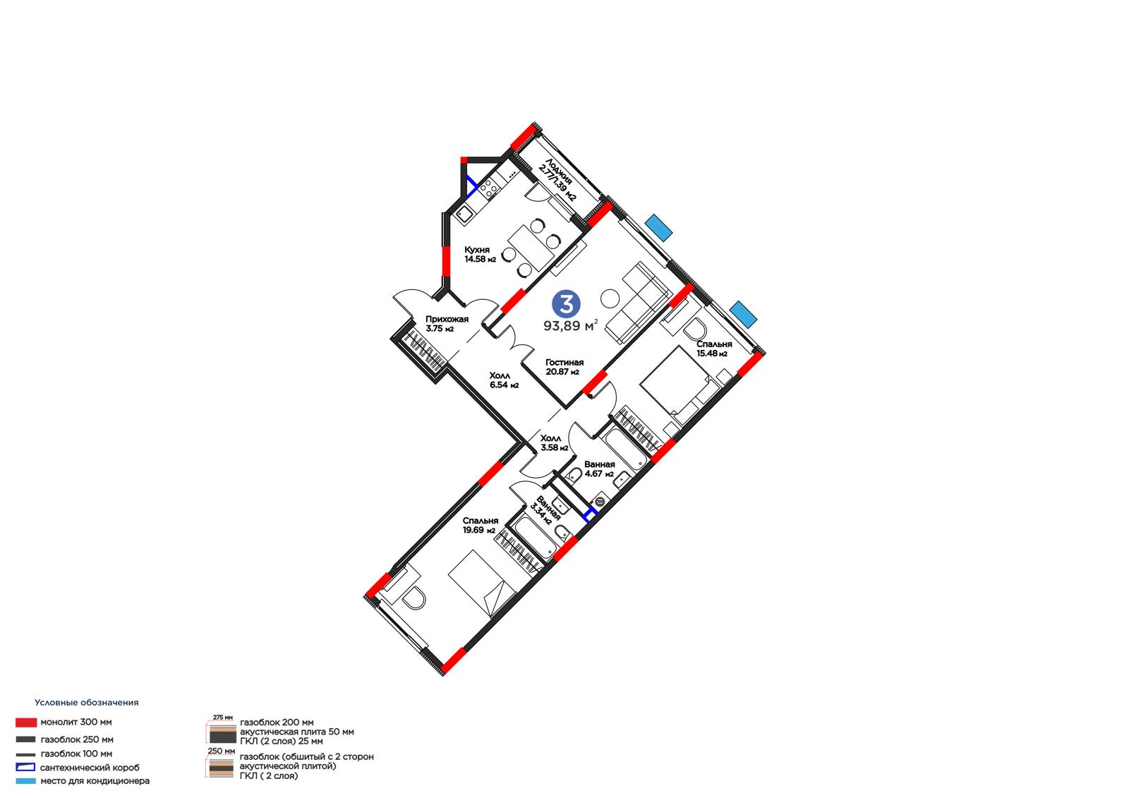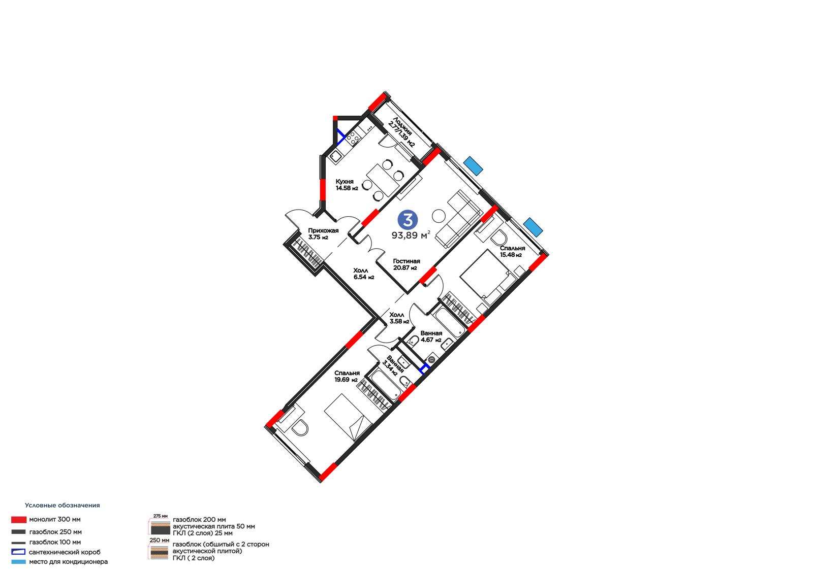 3-комн., 93.89 м², 6 этаж из 9 г. Астана, ул. Улы дала ЖК Bosağa