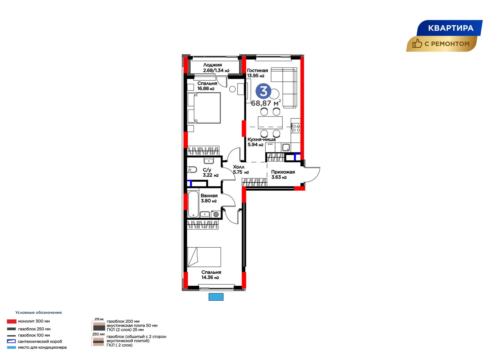 3-комн., 68.87 м², 3 этаж из 9 г. Астана, ул. Улы дала ЖК Bosağa