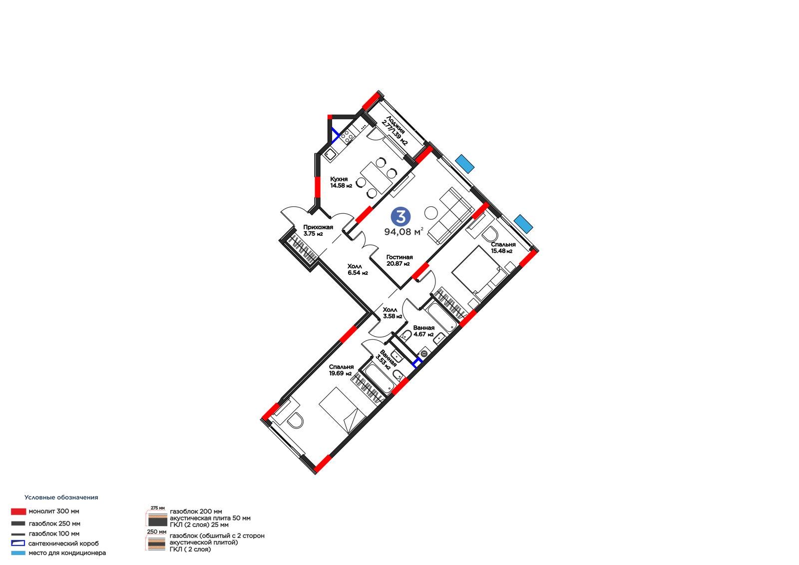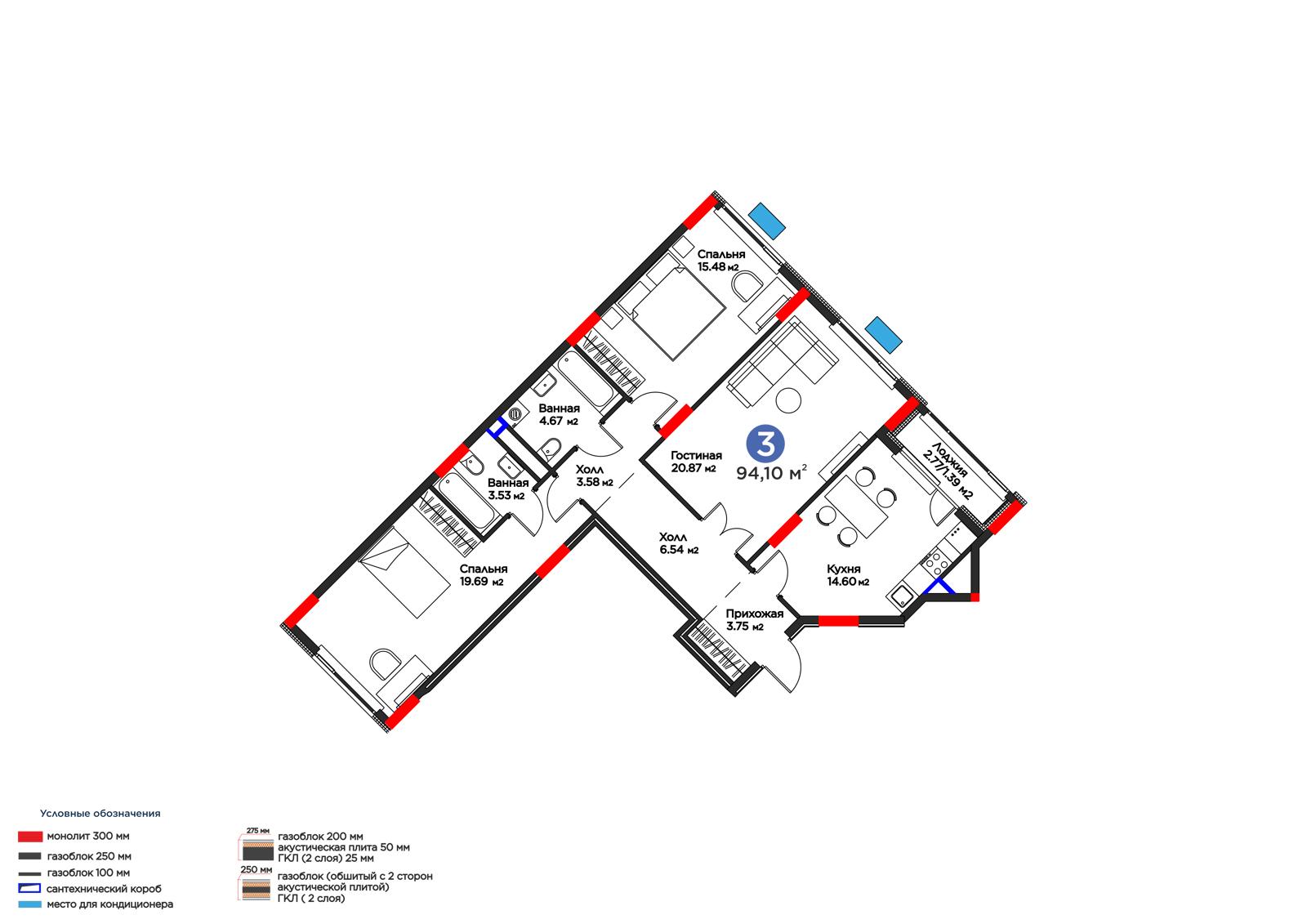 3-комн., 94.1 м², 3 этаж из 9 г. Астана, ул. Улы дала ЖК Bosağa