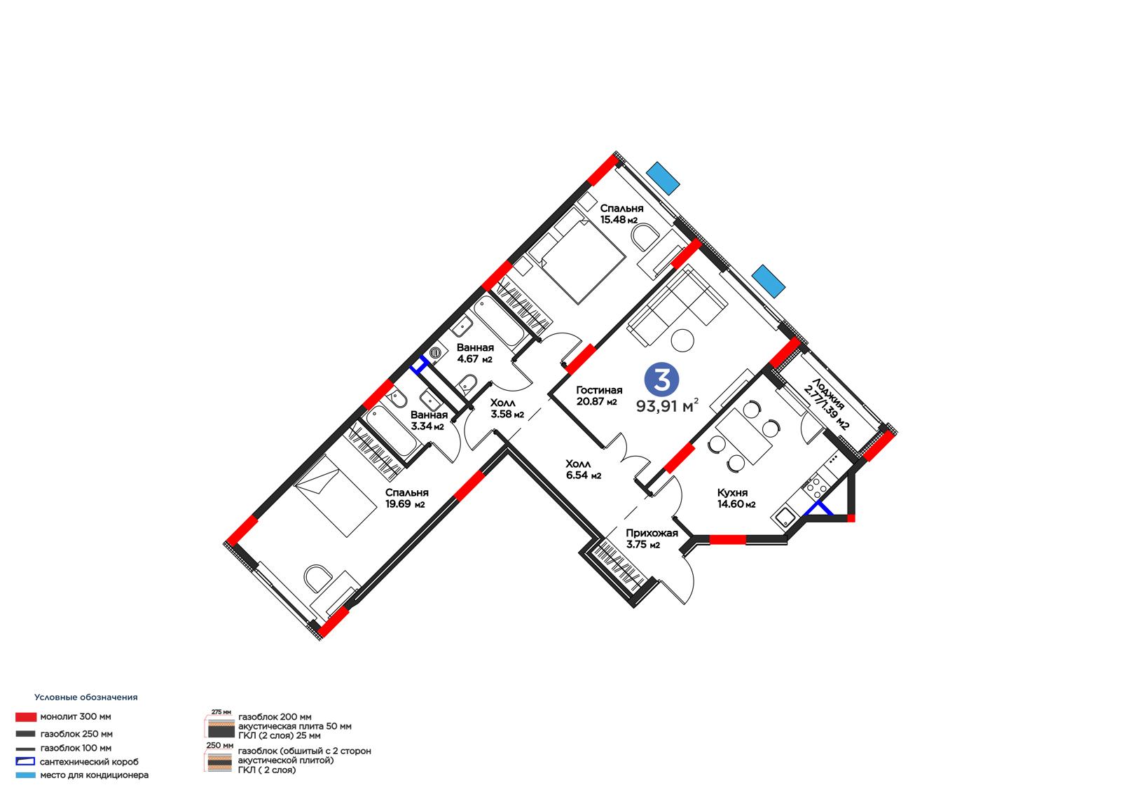 3-комн., 93.91 м², 7 этаж из 9 г. Астана, ул. Улы дала ЖК Bosağa