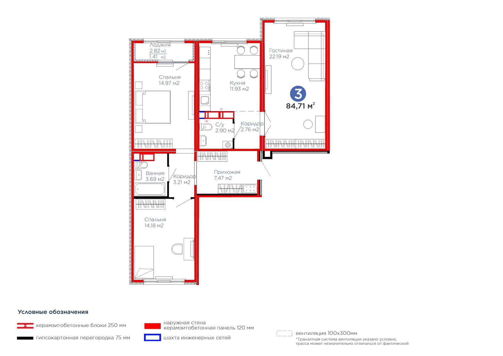 3-комн., 84.71 м², 2 этаж из 12 г. Астана, ул. Улы дала ЖК ŪIA.DARYN
