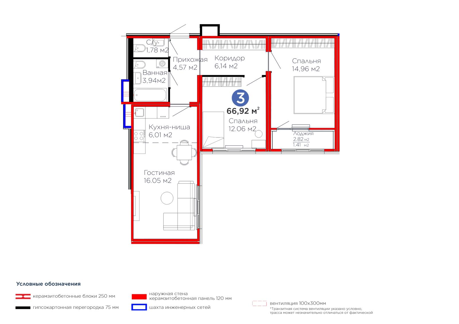 3-комн., 66.92 м², 4 этаж из 14 г. Астана, ул. Улы дала ЖК ŪIA.DARYN