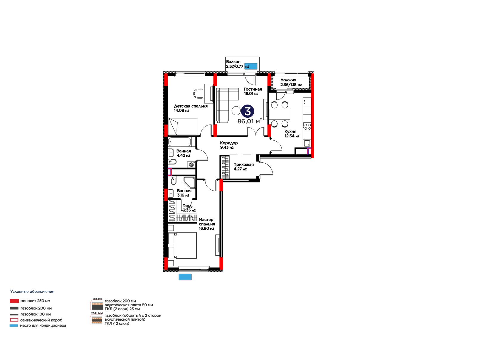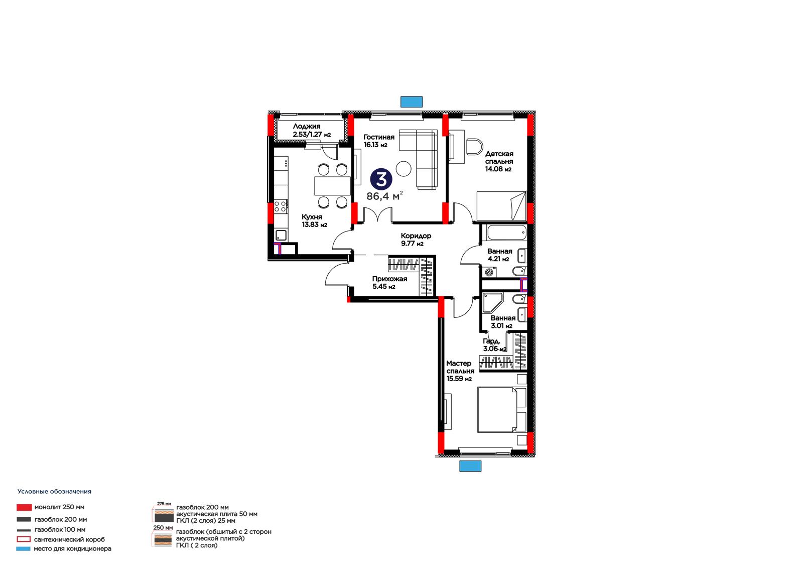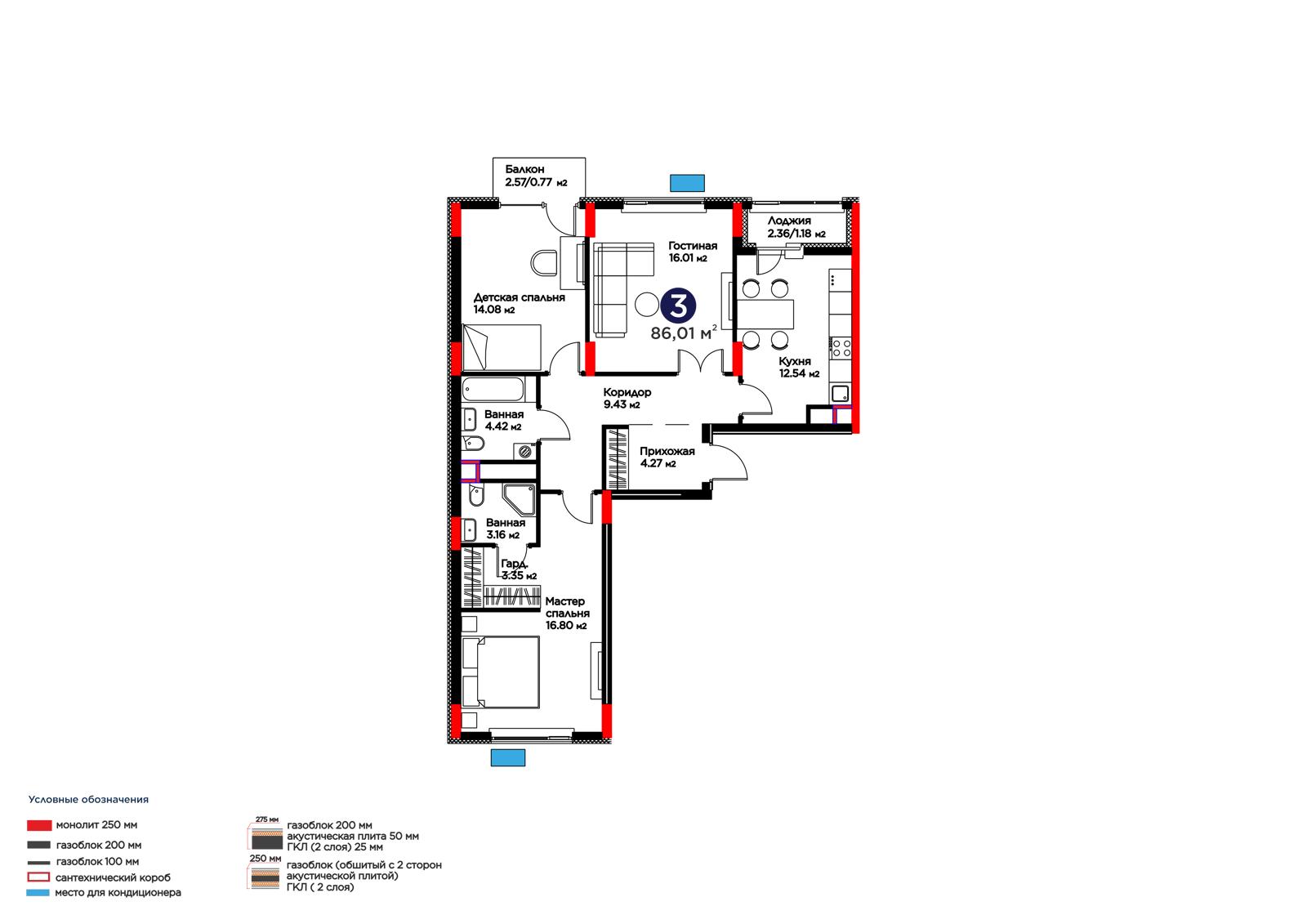 3-комн., 86.01 м², 7 этаж из 9 г. Астана, ЖК Lavita