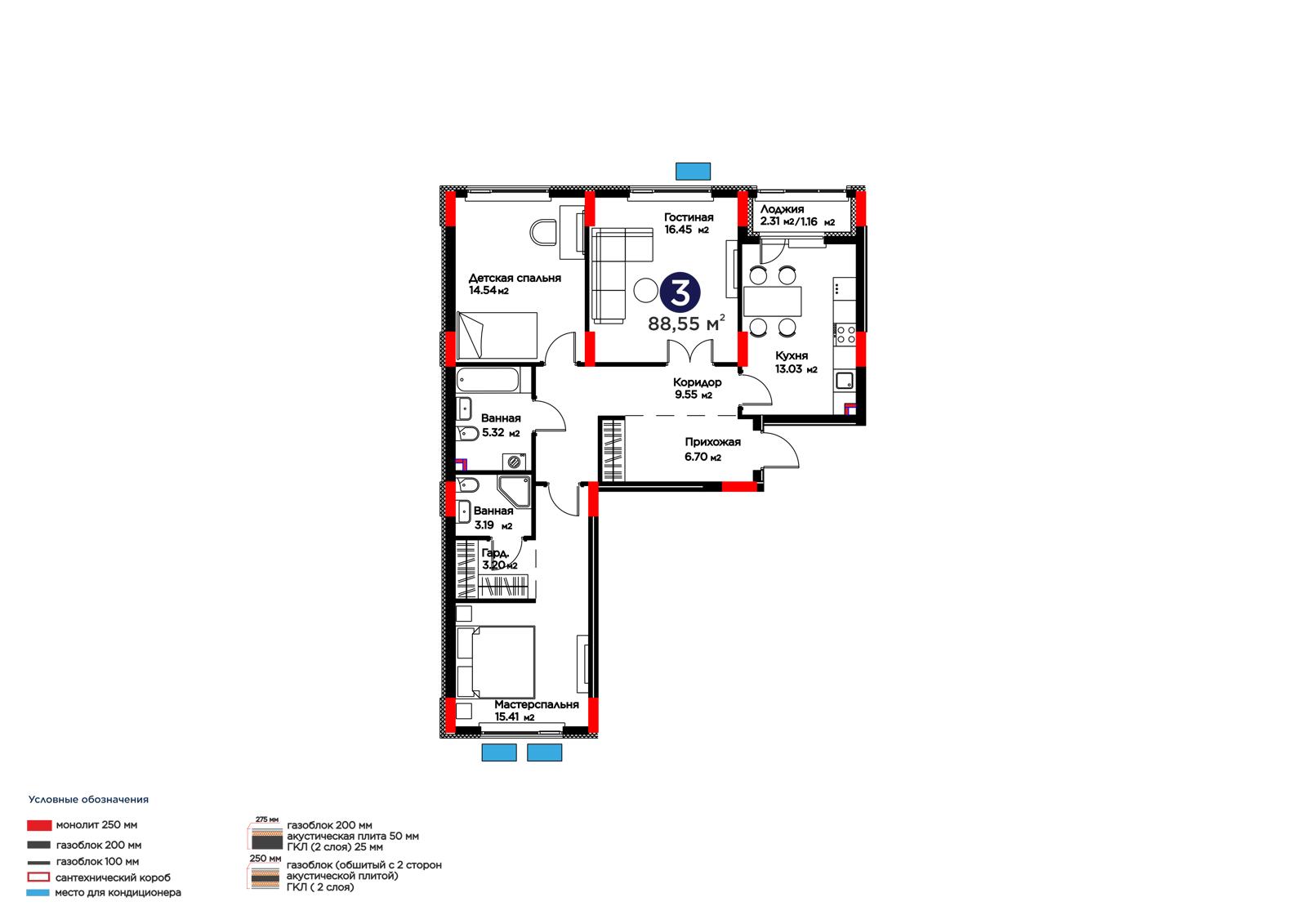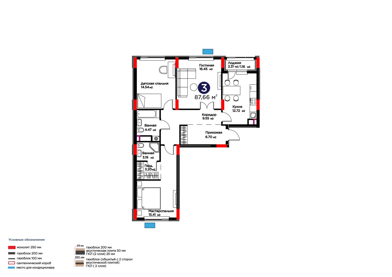 3-комн., 87.66 м², 3 этаж из 9 г. Астана, ЖК Lavita