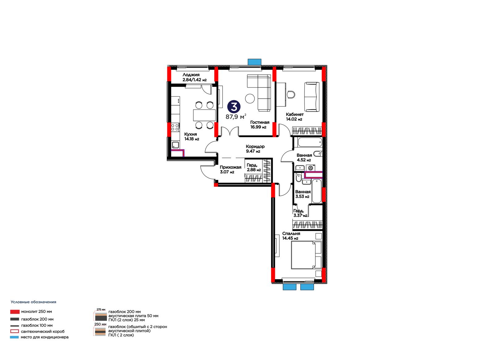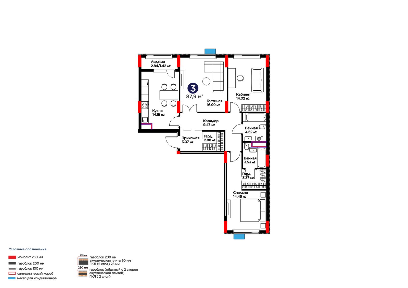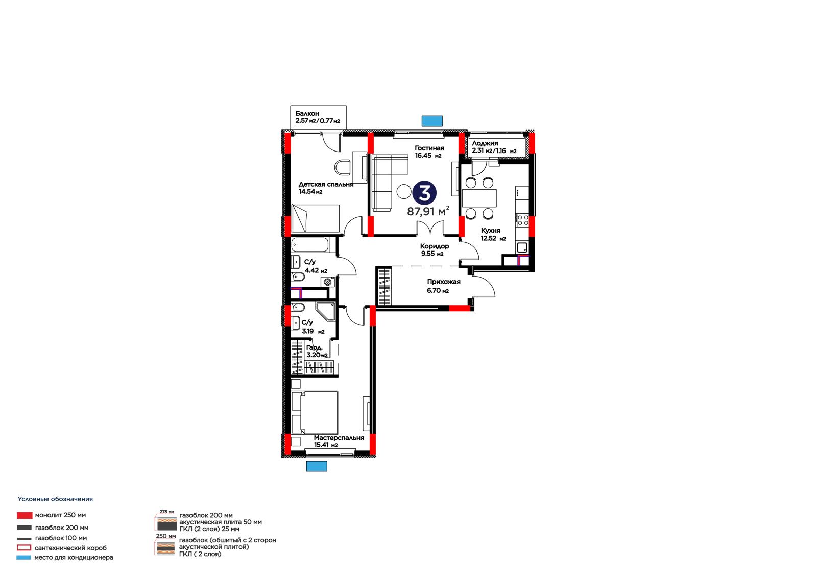3-комн., 87.91 м², 7 этаж из 9 г. Астана, ЖК Lavita