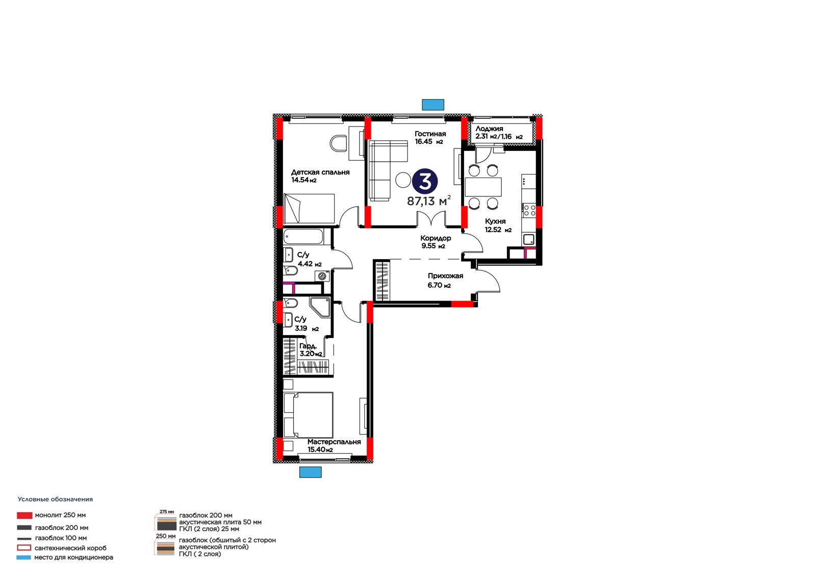 3-комн., 87.13 м², 8 этаж из 9 г. Астана, ЖК Lavita