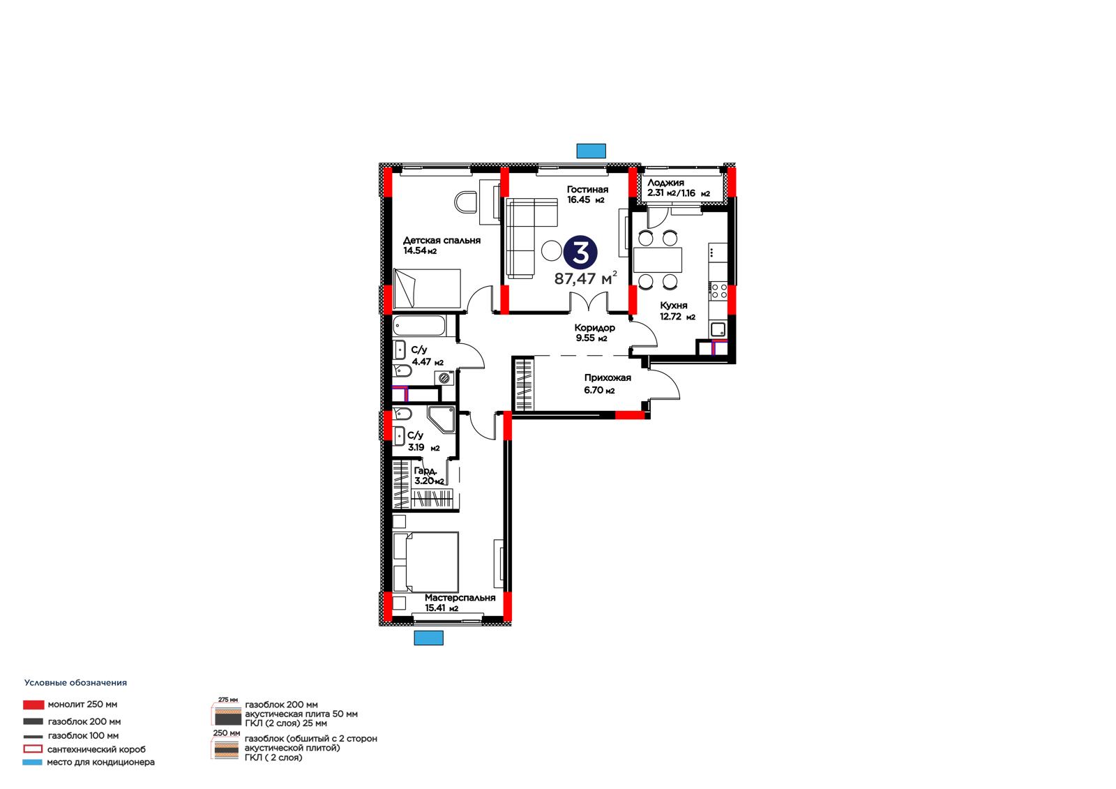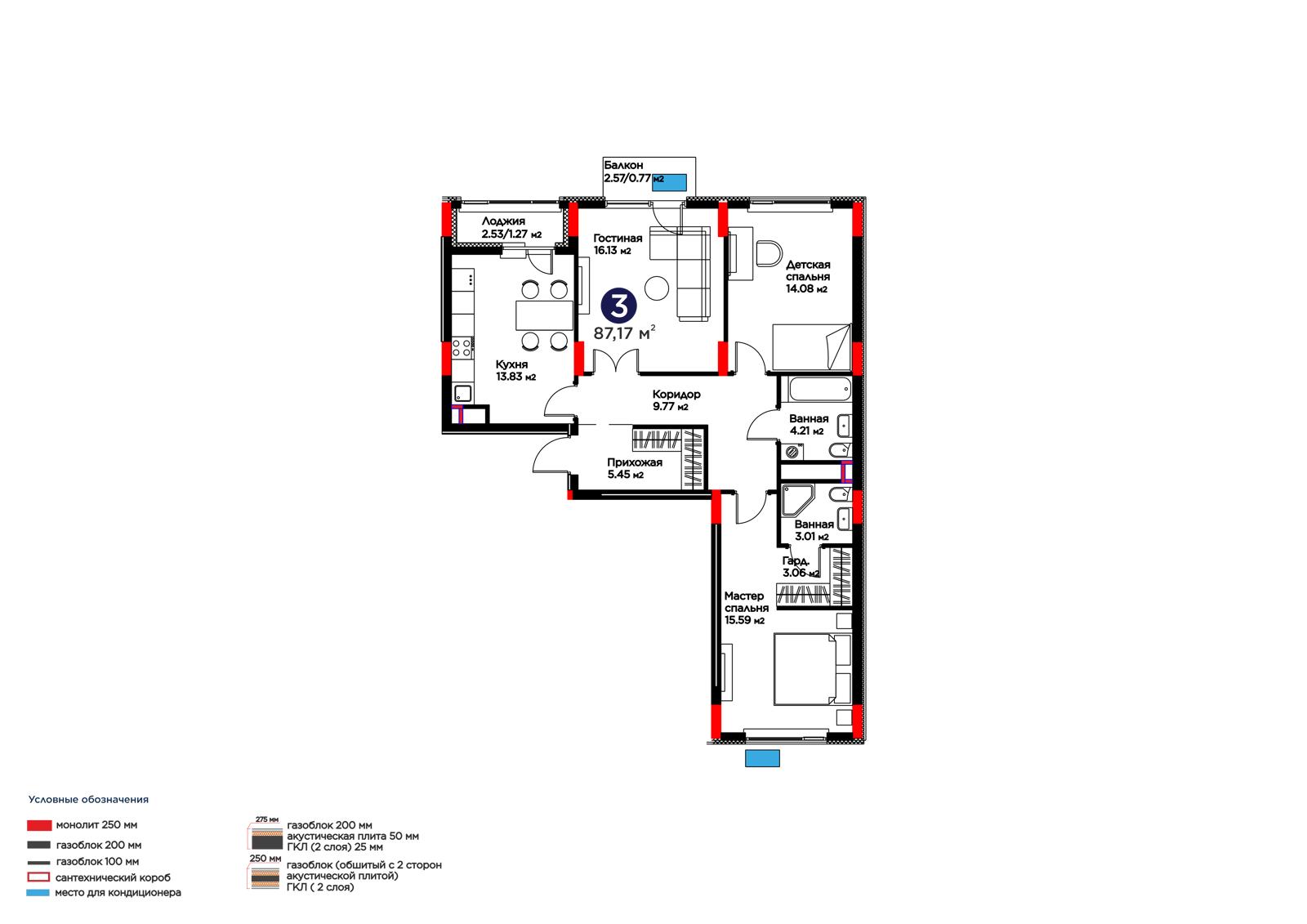 3-комн., 87.17 м², 7 этаж из 9 г. Астана, ЖК Lavita
