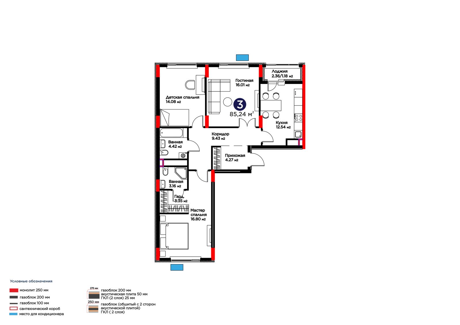 3-комн., 85.24 м², 6 этаж из 9 г. Астана, ЖК Lavita