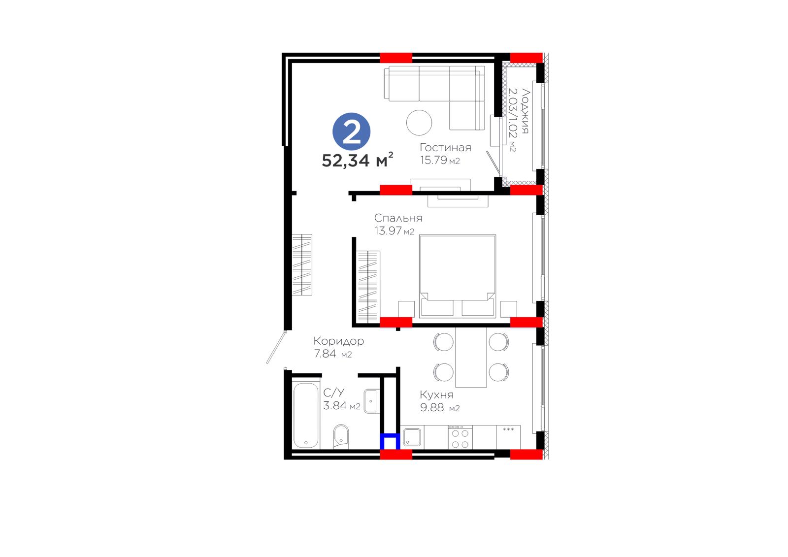 2-комн., 52.52 м², 2 этаж из 9 г. Астана, ул. Улы дала ЖК ŪIA.BIRLIK