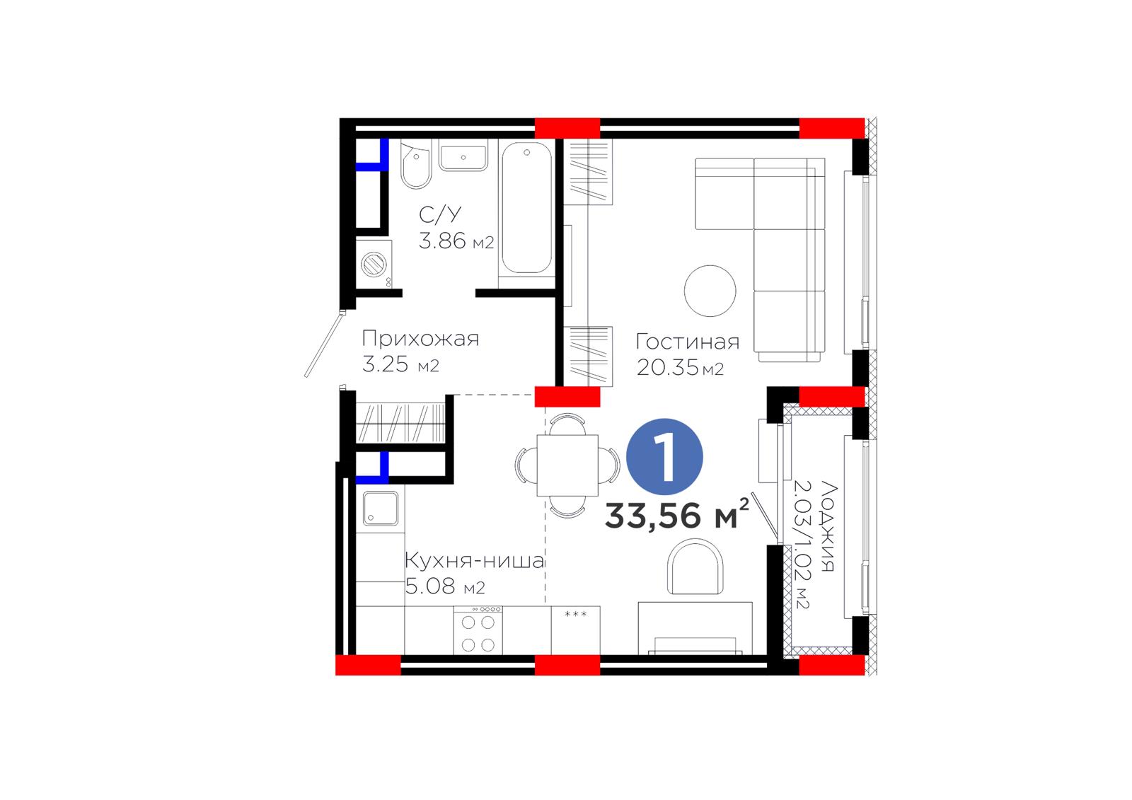 1-комн., 33.89 м², 2 этаж из 9 г. Астана, ул. Улы дала ЖК ŪIA.BIRLIK