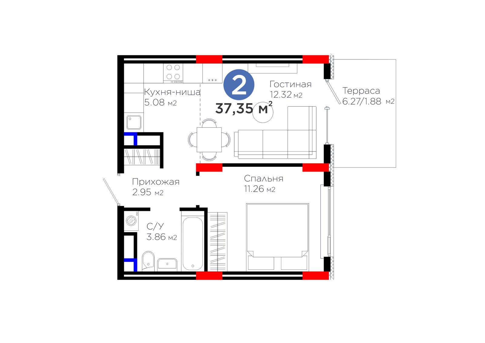 2-комн., 37.51 м², 1 этаж из 9 г. Астана, ул. Улы дала ЖК ŪIA.BIRLIK