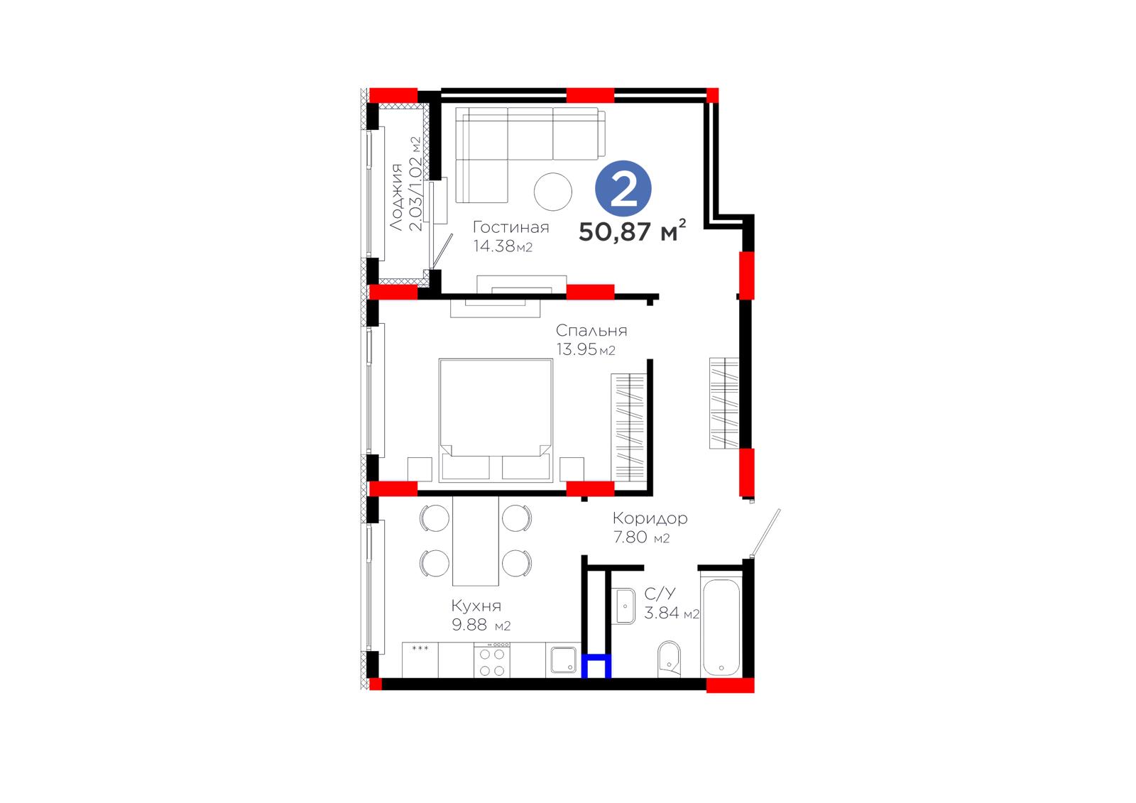 2-комн., 51.02 м², 2 этаж из 9 г. Астана, ул. Улы дала ЖК ŪIA.BIRLIK