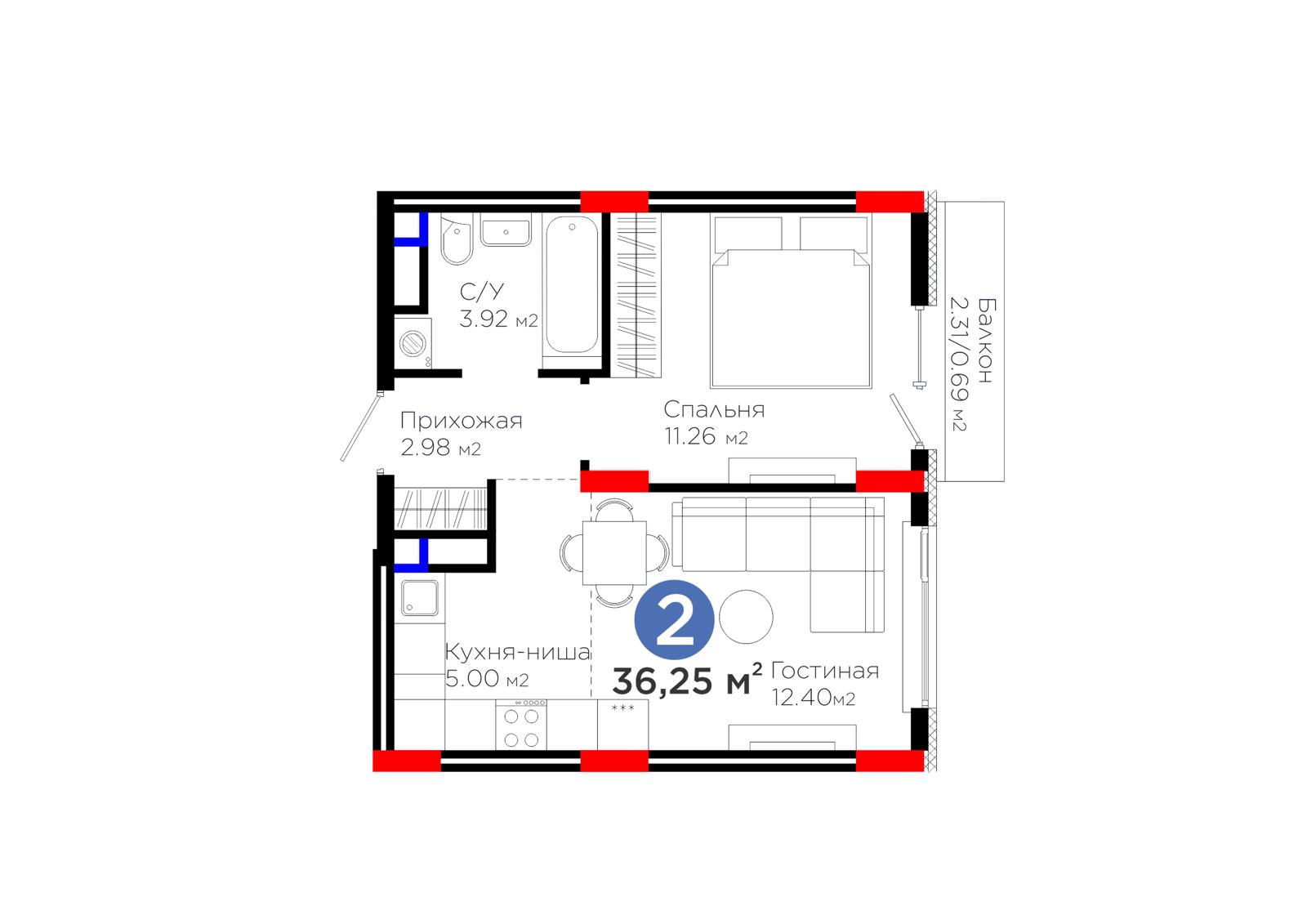 2-комн., 36.3 м², 6 этаж из 9 г. Астана, ул. Улы дала ЖК ŪIA.BIRLIK