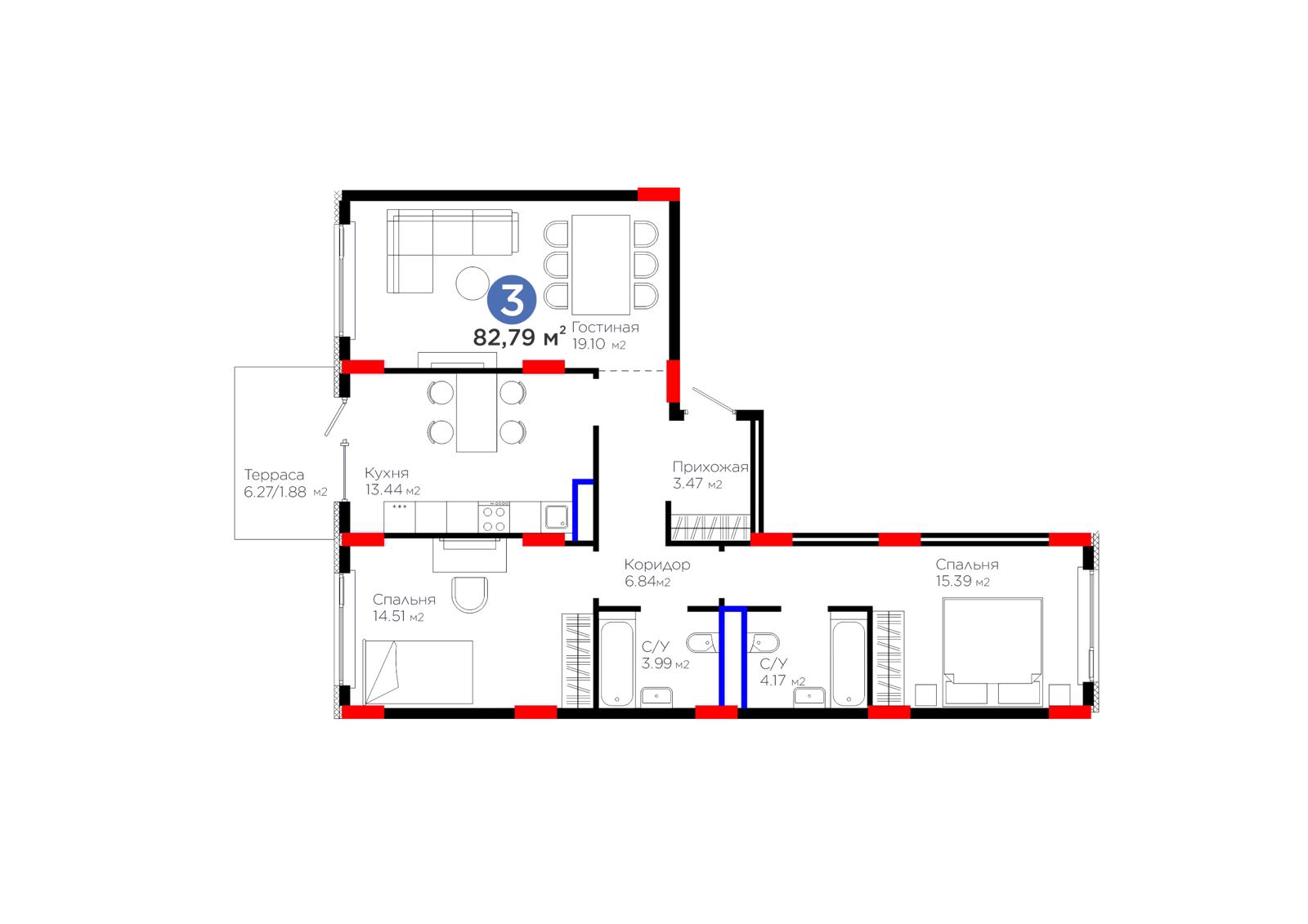 3-комн., 82.92 м², 1 этаж из 9 г. Астана, ул. Улы дала ЖК ŪIA.BIRLIK