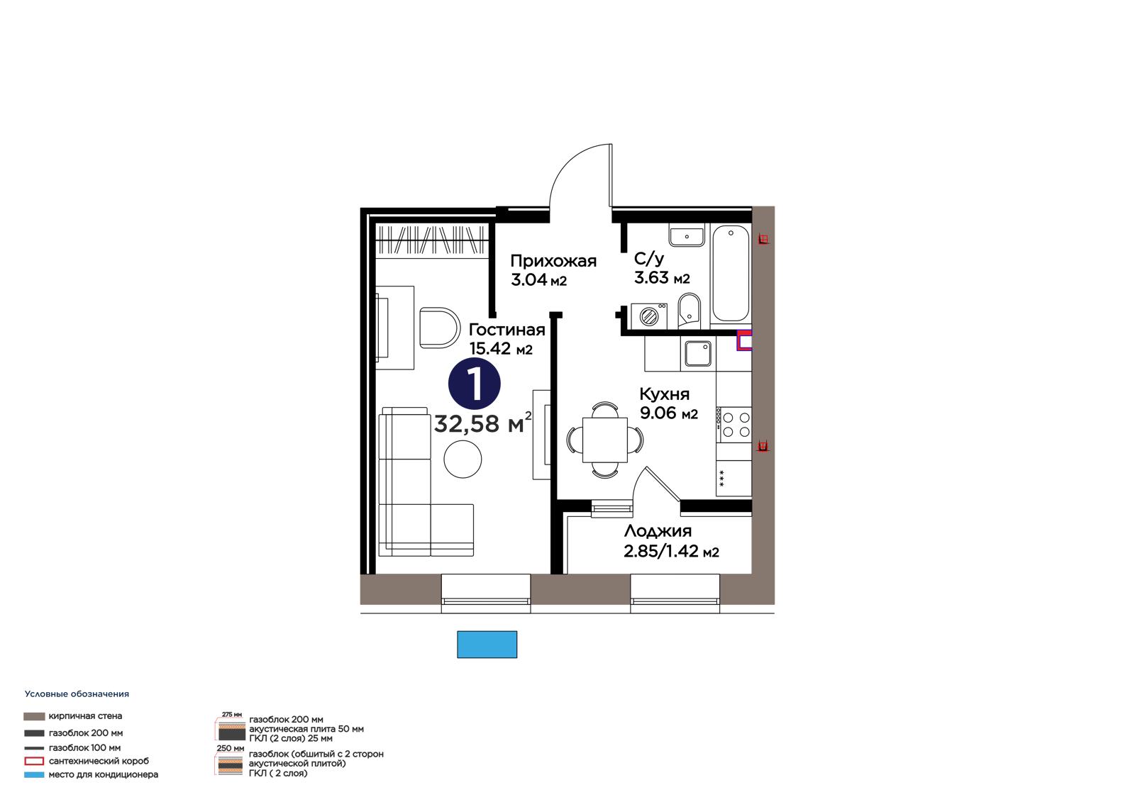 1-комн., 32.58 м², 2 этаж из 9 г. Астана, ЖК OİU