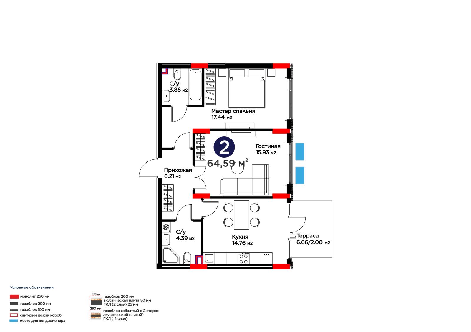 2-комн., 64.59 м², 2 этаж из 9 г. Астана, ЖК Lavita
