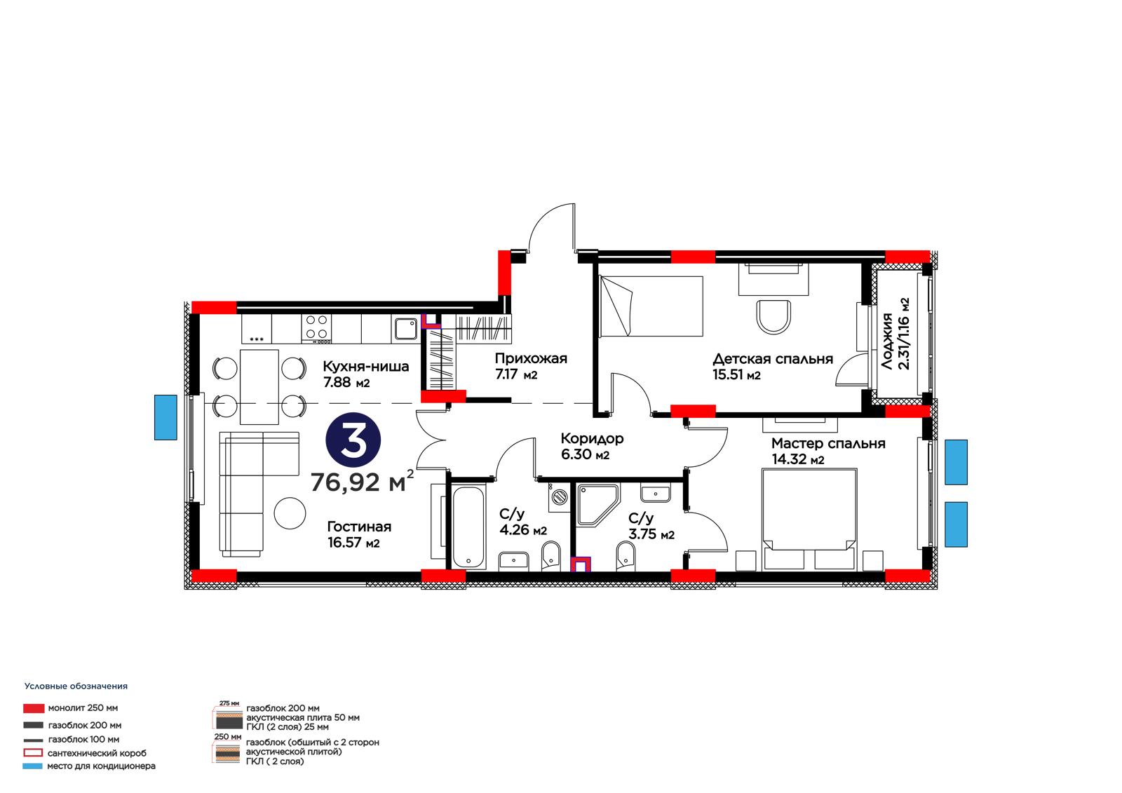 3-комн., 76.92 м², 2 этаж из 9 г. Астана, ЖК Lavita