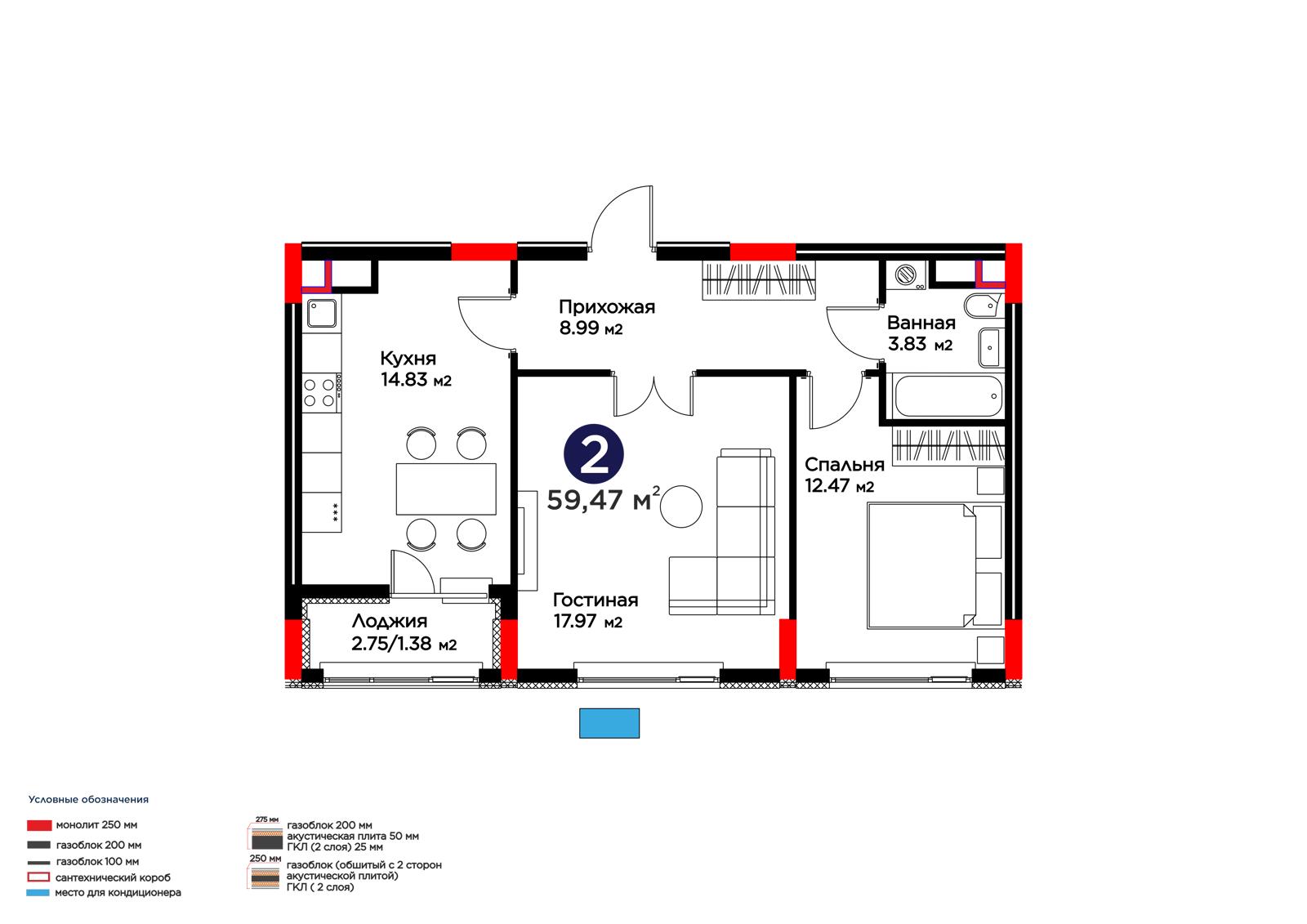 2-комн., 59.47 м², 6 этаж из 9 г. Астана, ЖК Lavita