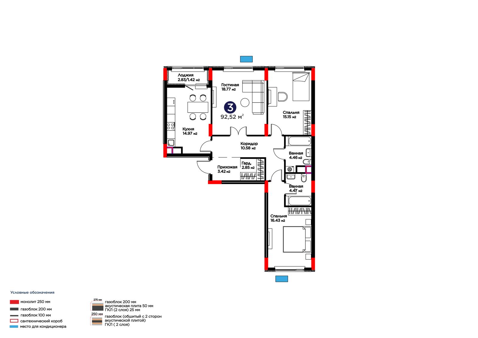 3-комн., 92.52 м², 8 этаж из 9 г. Астана, ЖК Lavita