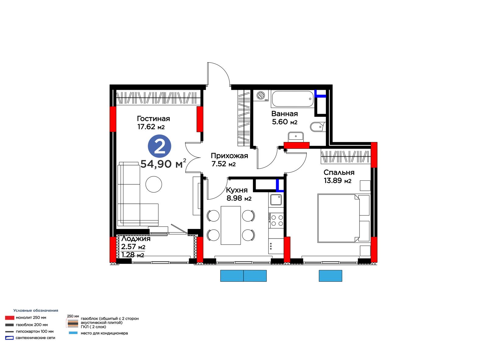 2-комн., 54.9 м², 9 этаж из 9 г. Атырау, ул. Абылхайыр Хан ЖК SANDI