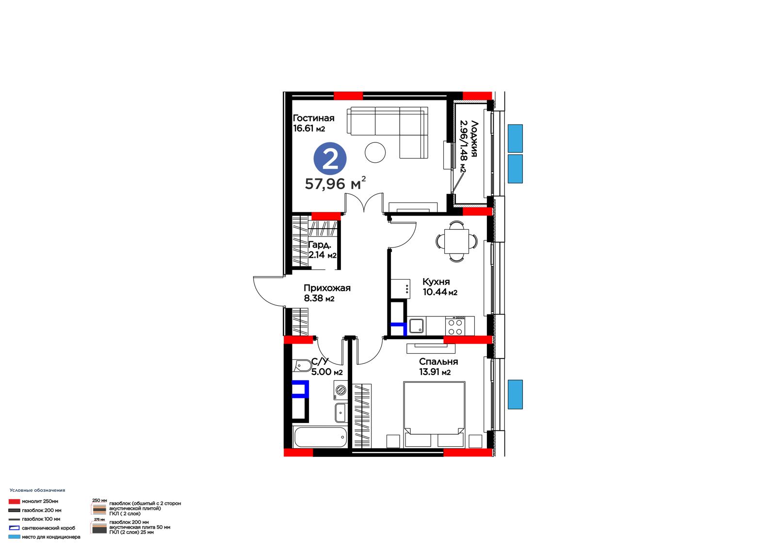 2-комн., 57.96 м², 7 этаж из 9 г. Атырау, ул. Абылхайыр Хан ЖК Batysmūra Prime