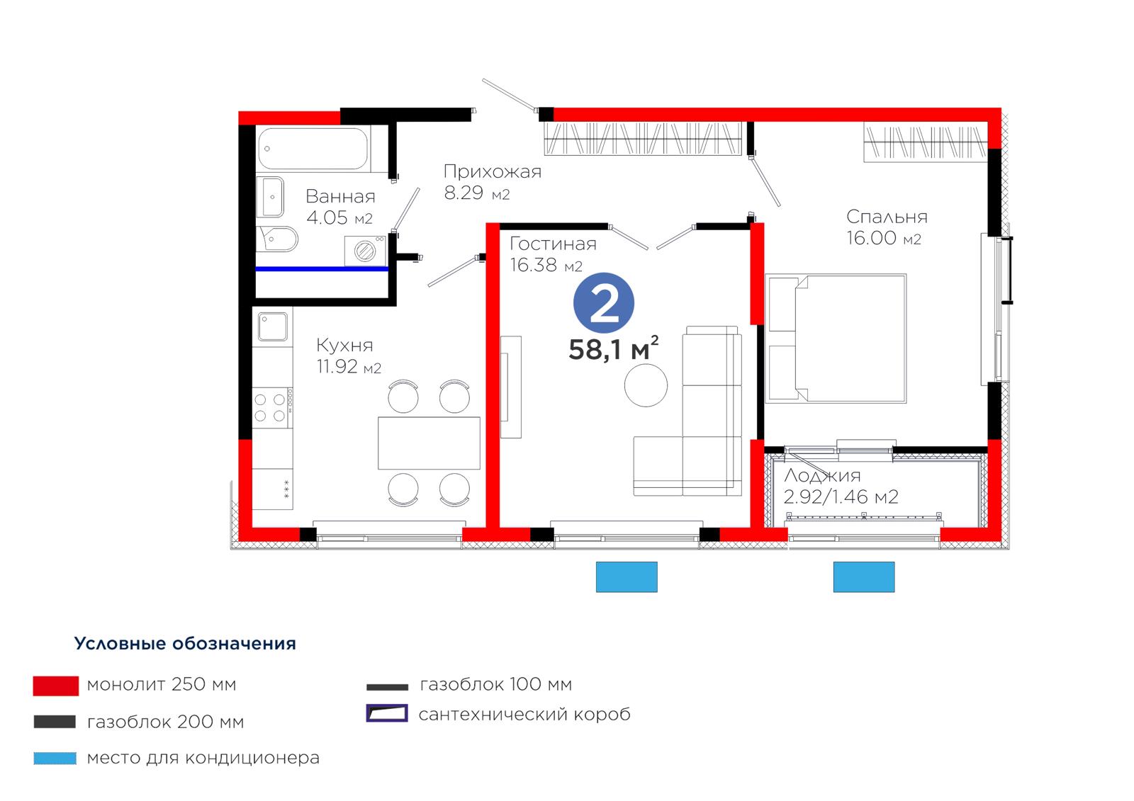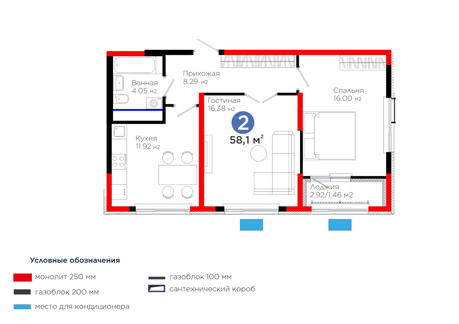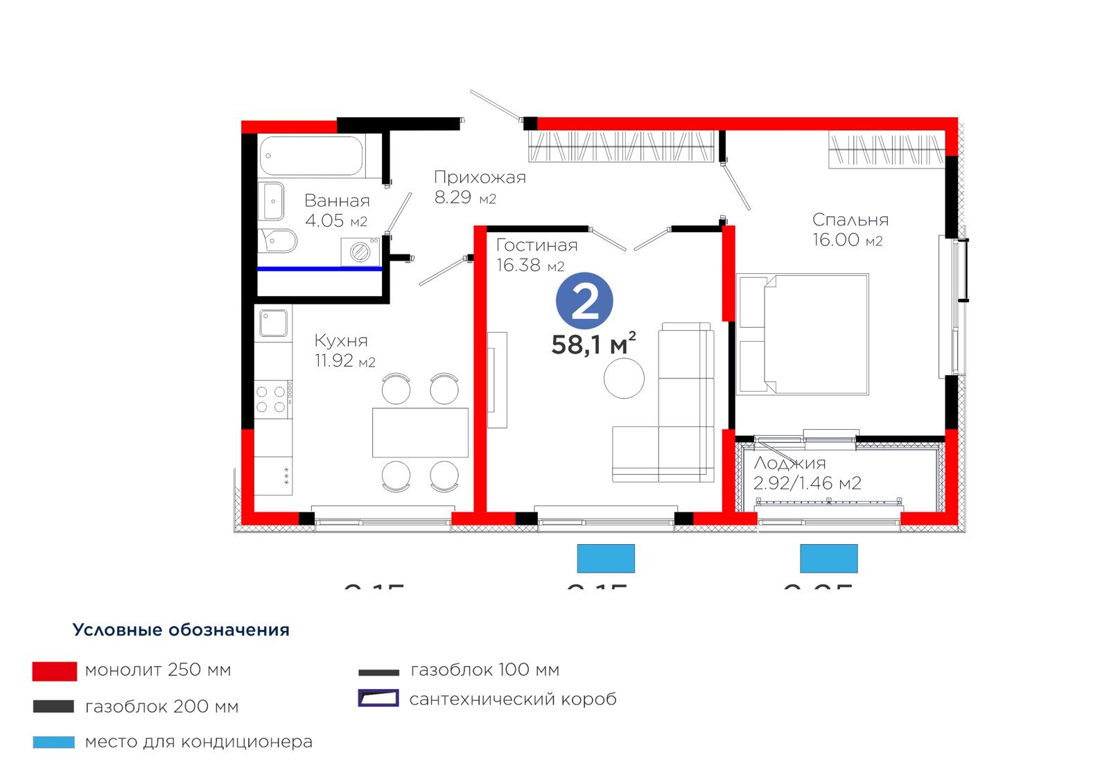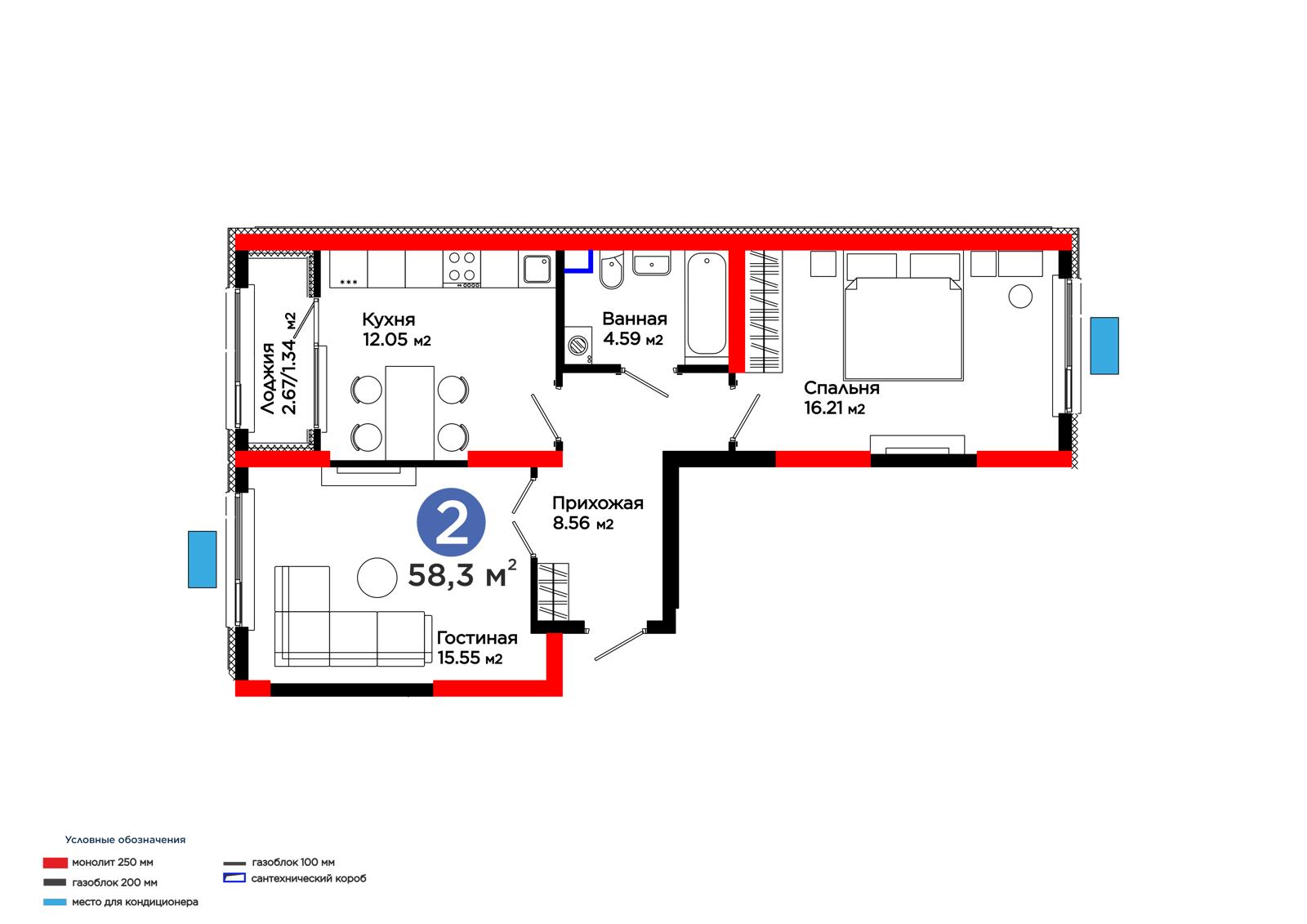 2-комн., 58.25 м², 11 этаж из 12 г. Шымкент, ул. Толеметова ЖК Grand Park. Vita