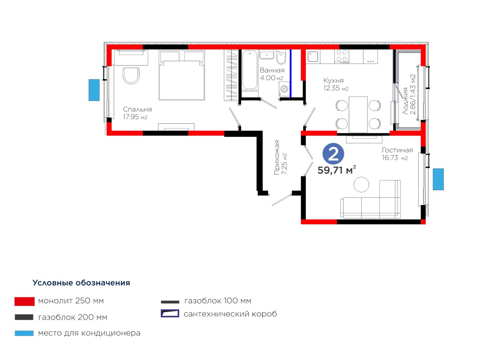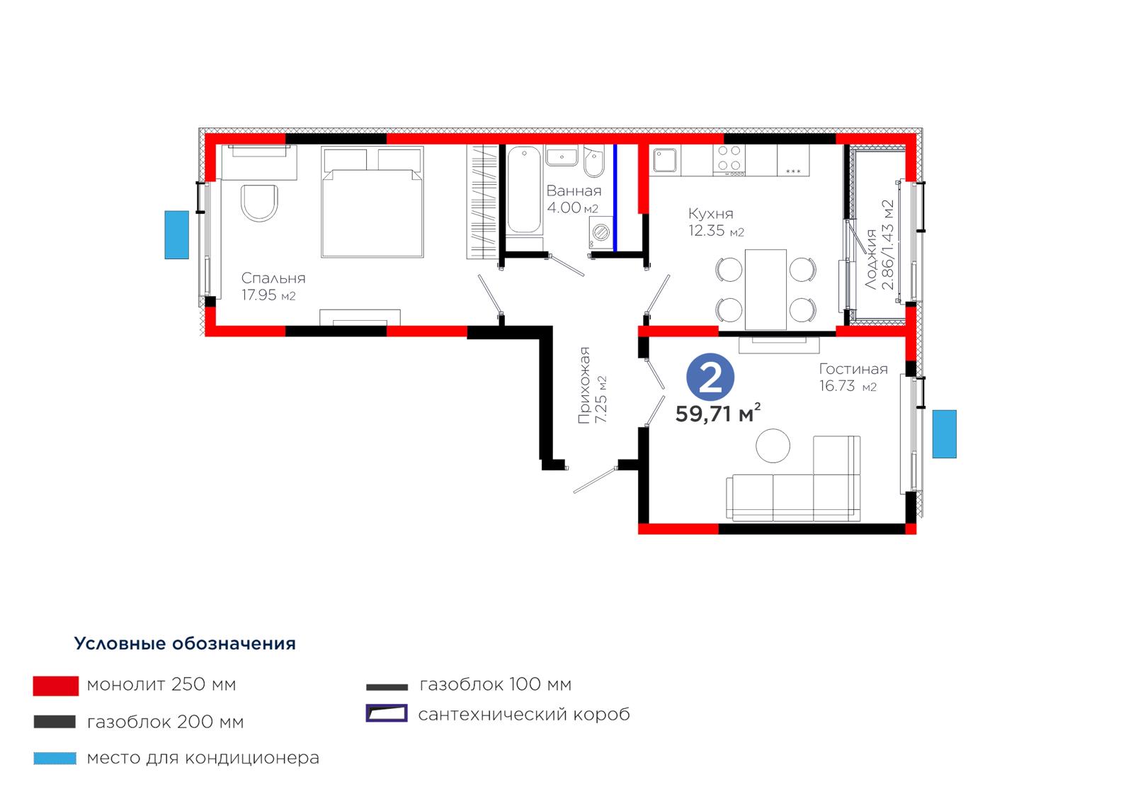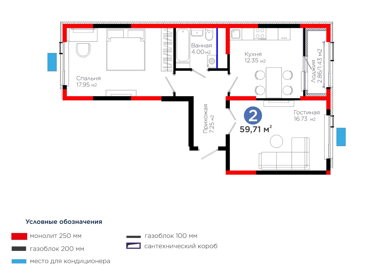 2-комн., 59.71 м², 12 этаж из 12 г. Шымкент, ул. Толеметова ЖК Grand Park. Vita