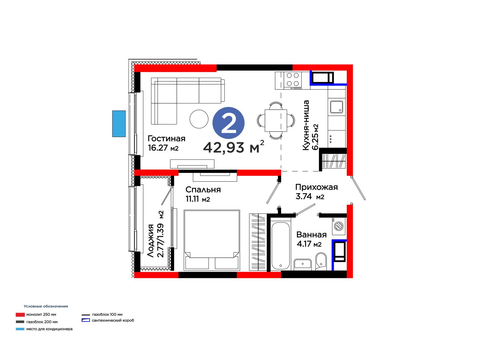 2-комн., 42.94 м², 9 этаж из 12 г. Шымкент, ул. Толеметова ЖК Grand Park. Vita