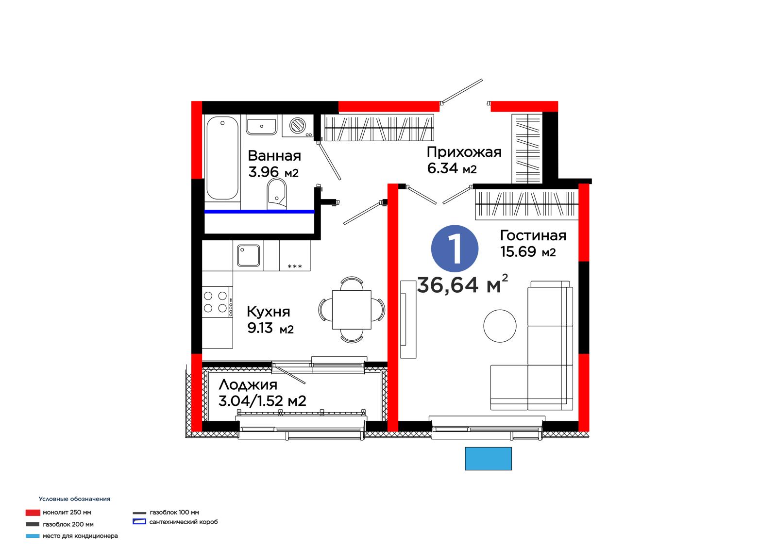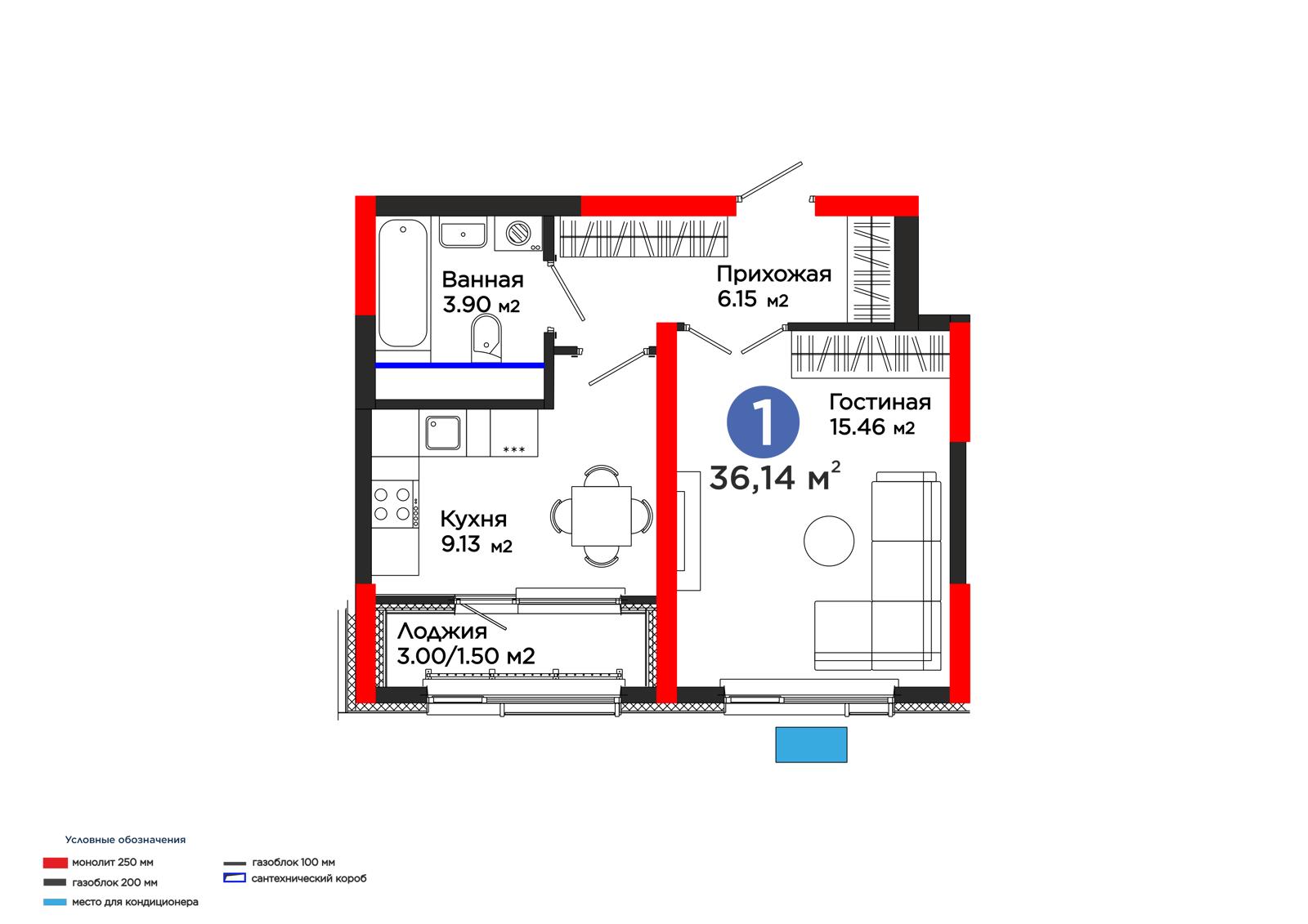 1-комн., 36.14 м², 3 этаж из 12 г. Шымкент, ул. Толеметова ЖК Grand Park. Vita