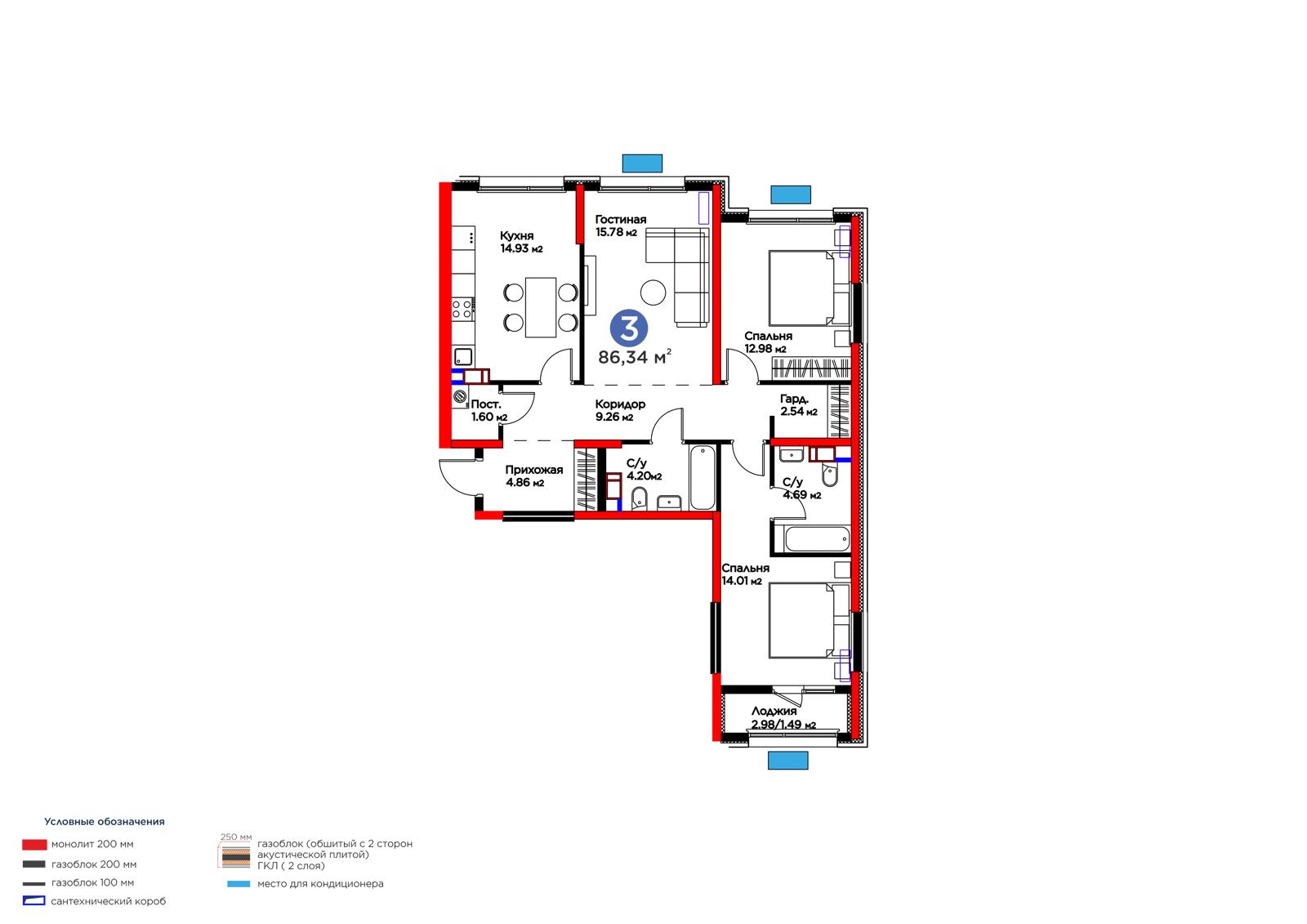 3-комн., 86.34 м², 5 этаж из 16 г. Шымкент, ЖК Flora Gardens
