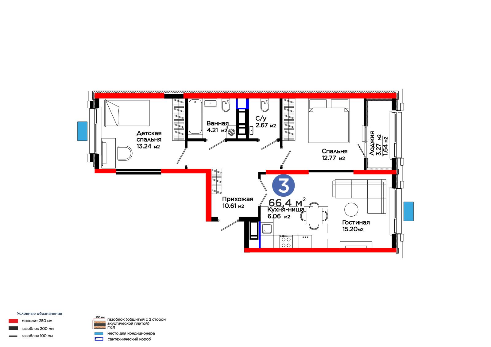 3-комн., 66.4 м², 7 этаж из 16 г. Шымкент, ул. Калдаякова (Ильича) ЖК 4Seasons. Joy