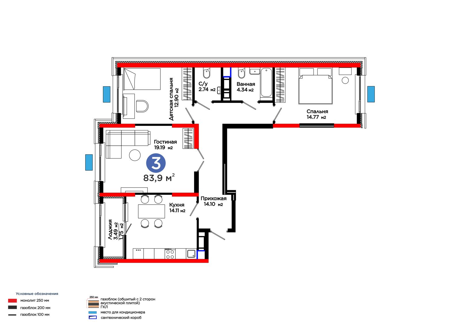 3-комн., 83.9 м², 12 этаж из 16 г. Шымкент, ул. Калдаякова (Ильича) ЖК 4Seasons. Joy